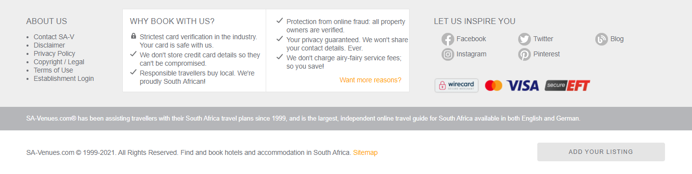 South Africa Venues is a website for tourists in South Africa. Their website footer is especially remarkable for us because of the 'Why Book with Us?' section. It has a good chance of converting visitors into customers by providing them with the benefits of booking with them. Apart from that, you can also see the type of payment methods they accept. You land on their homepage and you have all the need-to-know information right there.