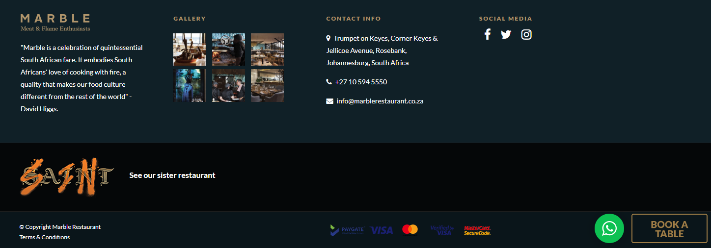 Marble Restaurant has a great footer that includes a star testimony, gallery, contact information, and social media. What's more? They have also advertised their sister restaurant. Lastly, at the very bottom, they have a WhatsApp message button along with the payment methods they accept. We feel that this is a perfect footer for a restaurant website design as it provides all the necessary information right at the bottom.